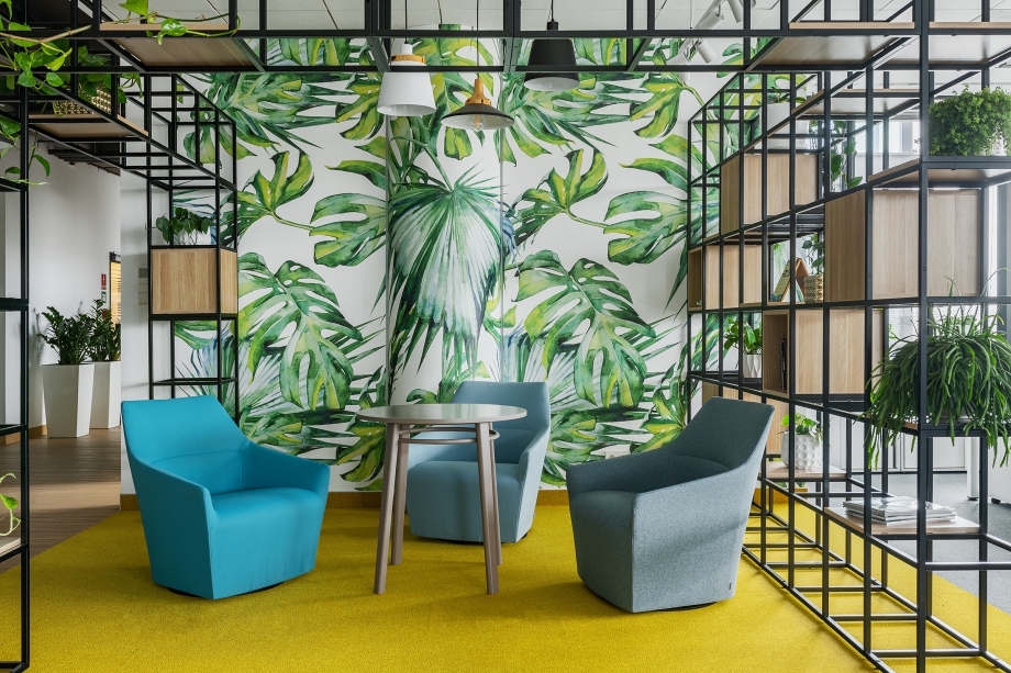 Sama przestrzeń pracownicza nie podlegała metamorfozie, ale chcieliśmy wprowadzić nutkę zabawy. Zaproponowaliśmy stworzenie mini strefy chillout z rajska tapetą i ciepłymi kolorami odgrodzonej od biura regałami pełnymi książek, czasopism i zieleni. To w tej strefie pracownicy odpoczywają najchętniej. Zaaranżowaliśmy również miejsca szybkich spotkań, gdzie dzięki zastosowaniu odpowiednich mebli akustycznych, w ciszy i skupieniu można omówić bieżące plany i działania ze współpracownikami.