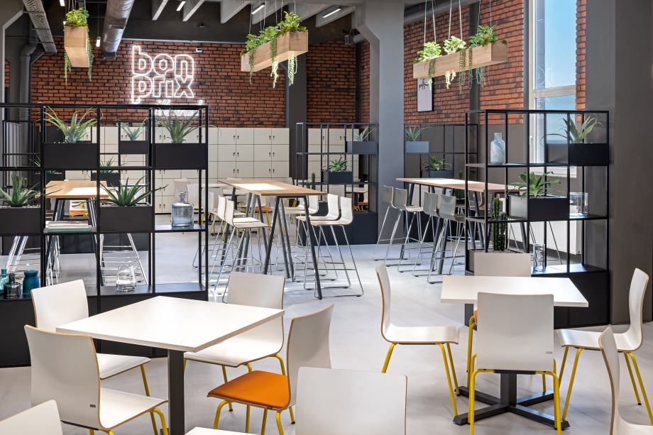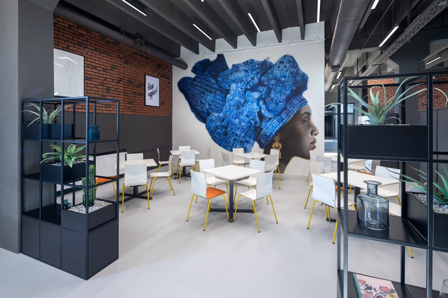 Projektowanie dla firmy zajmującej się modą to wyjątkowo przyjemny temat. Realizacja przedstawia wnętrze kantyny, które pomimo loftowego stylu wydaje się być bardzo ciepłe w odbiorze. Przestrzeń wypełniają meble typowe dla stolówek i kantyn biurowych. Jednak dodatki powodują, że całość jest bardzo przytulna, przyjazna i komfortowa dla oka. Stylowe dekoracje ścienne podkreślają charakter przestrzeni a elementy biofilii dopełniają całość.