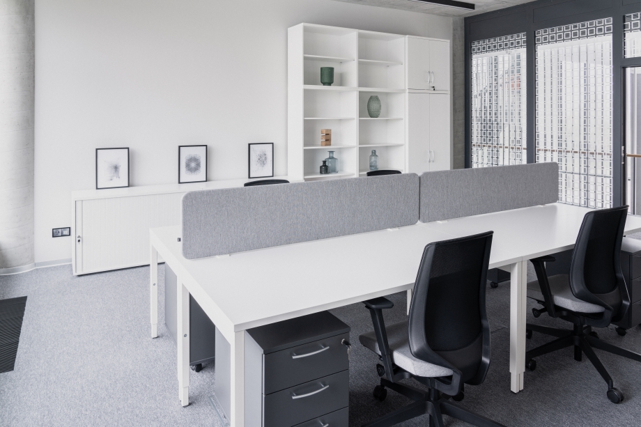 Proste, białe krzesła, jasne stanowiska pracy, akustyczne przegrody w tonacji szarosci oraz elmenty białych regałów sprawiają, że przestrzeń wydaje się być świeża i surowa.